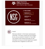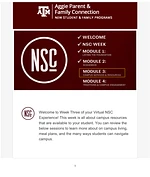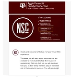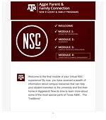 As a reminder: Your student will receive access to their NSC content the Friday before their scheduled NSC. Please ensure they are checking their personal and TAMU email accounts as we are sending frequent communication regarding the virtual NSC. An overview of the student experience can be found at tx.ag/NSCoverview.
